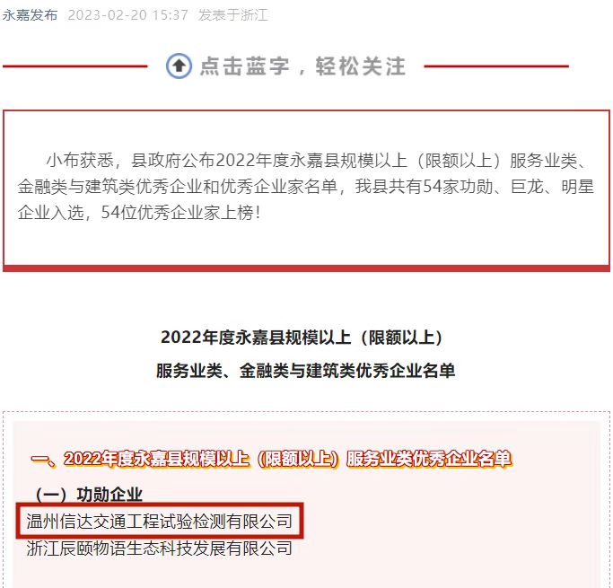 日前,永嘉县政府公布2022年度永嘉县规模以上(限额以上)服务业类优秀企业名单,诚达公司下属信达检测公司获评“永嘉县2022年度功勋企业”称号。2018至2020年,公司已连续三年荣获永嘉县明星企业称号。继2021年获评“永嘉县巨龙企业”称号后,今年首获“永嘉县功勋企业”称号。