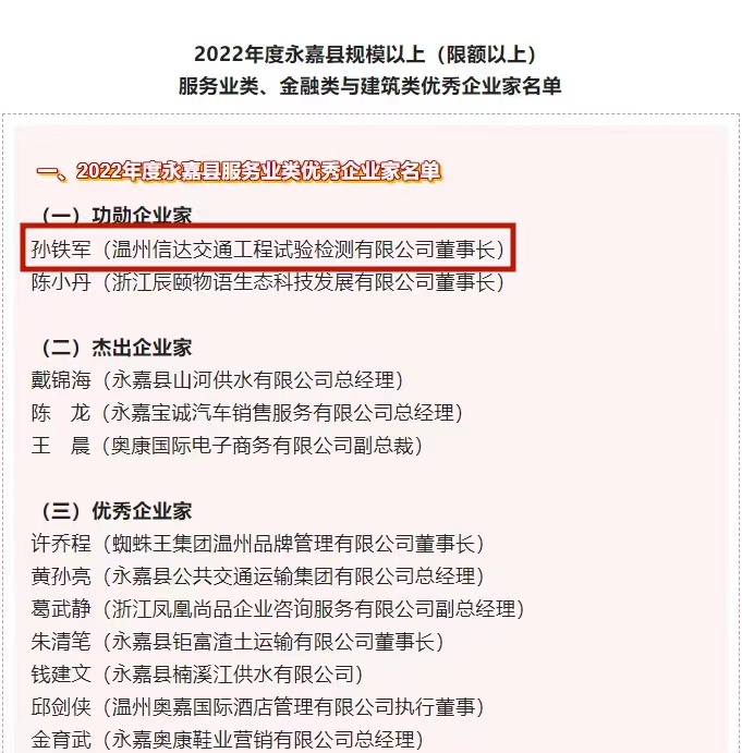 诚达公司下属信达检测公司获评“永嘉县功勋企业”