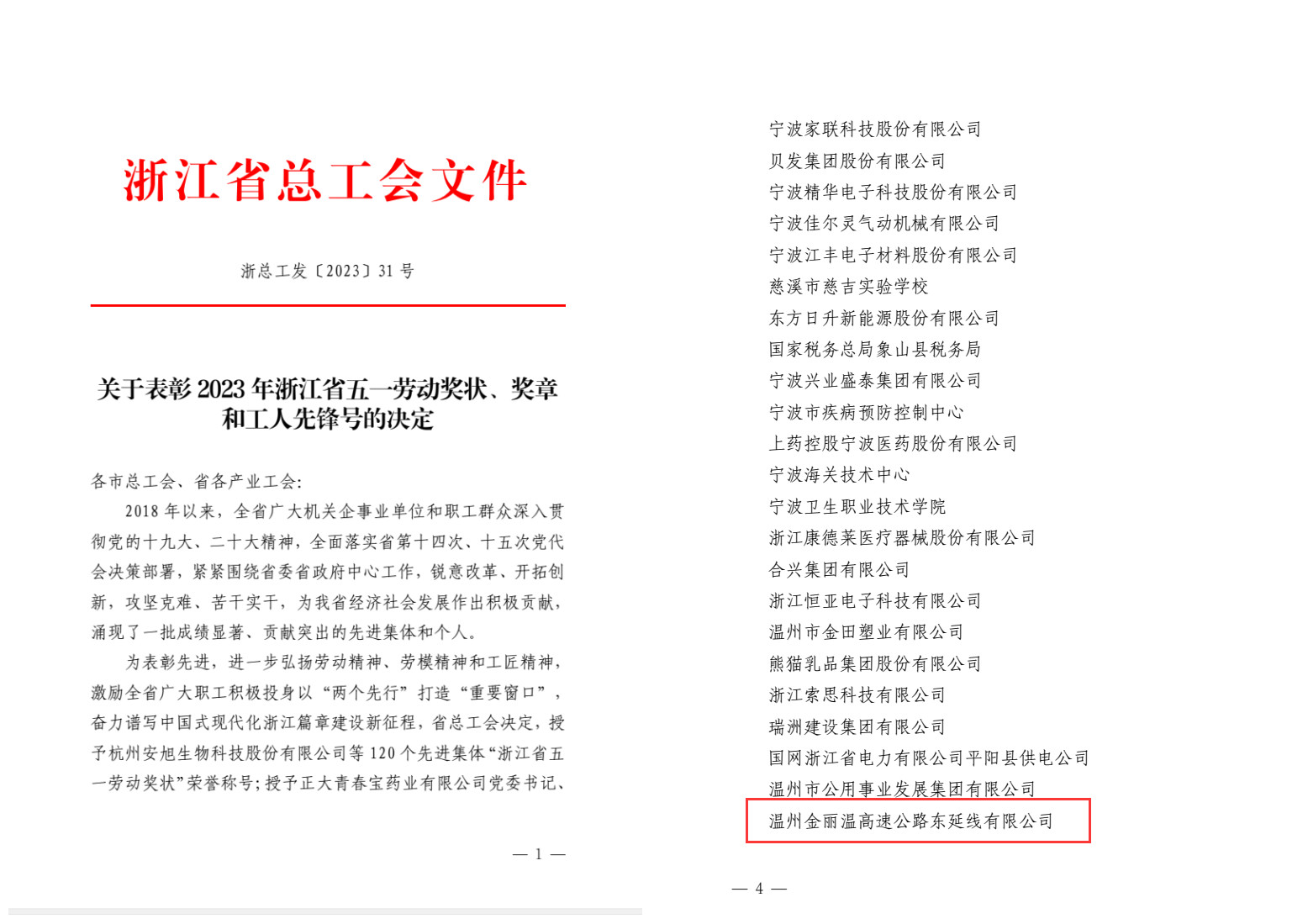 近日,浙江省总工会印发《关于表彰2023年浙江省五一劳动奖状、奖章和工人先锋号的决定》,东延线公司荣获“浙江省五一劳动奖状”荣誉称号。