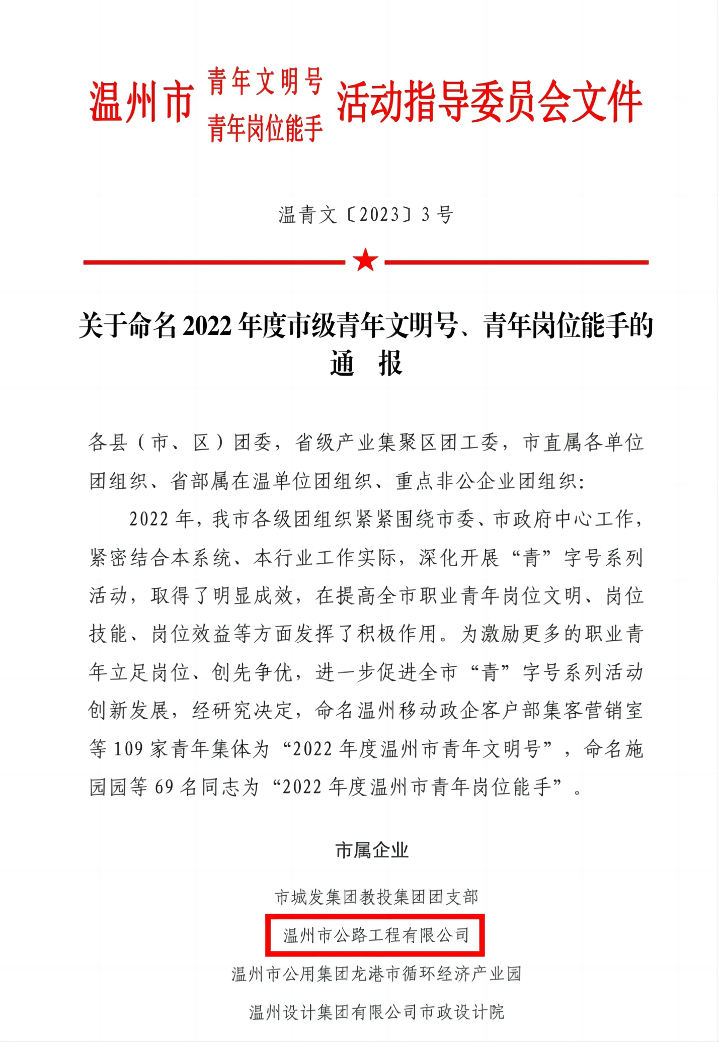 近日,温州市青年文明号、青年岗位能手活动指导委员会发布2022年度温州市青年文明号集体名单,公路工程公司成功入选,这是公路工程公司在精神文明建设中获得的又一项重大荣誉。