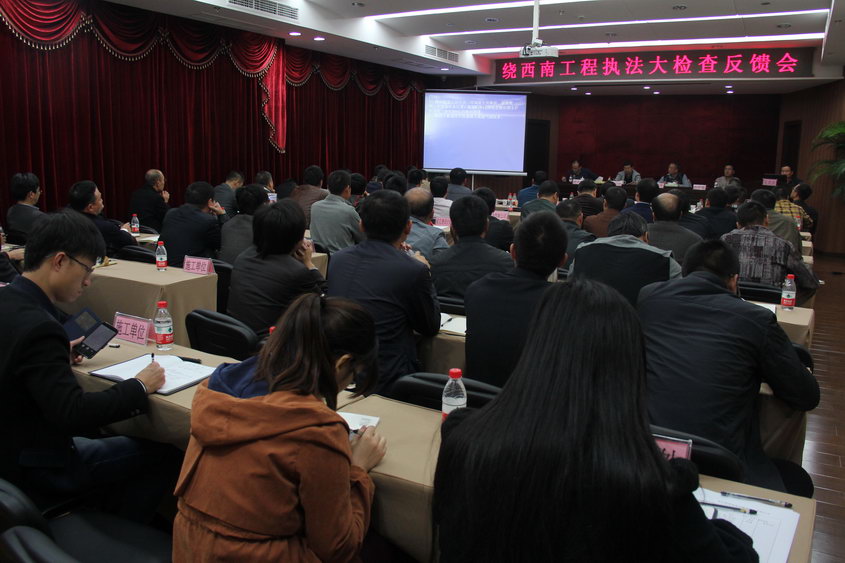 11月17-20日,省交通运输厅工程质量监督局副局长丁正祥率有关部室负责人及检查组对绕西南项目开展执法大检查。市交通质监局局长周建华、副局长王光达和项庆明,市交投集团副总经理管连众、绕西南公司副总经理陈照亮等陪同检查。