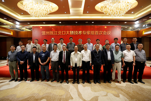 在庄严大气的聘任仪式上,陈利幸和陈建明为瓯江北口大桥技术专家组全体成员颁发了聘书,并合影留念。