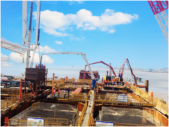 瓯江北口大桥中塔钢沉井进行井壁混凝土灌注