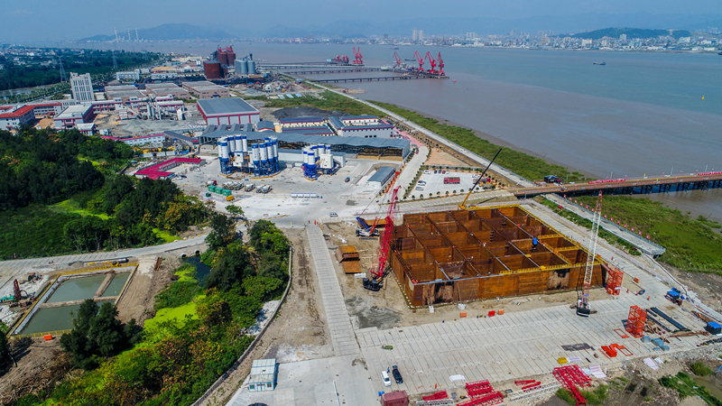 为了保证质量,钢沉井模块全部采用工厂化生产,经海上运输到现场进行拼装。为了保障拼装的精准度,施工单位中交二航局对地基采用砂桩换填的方式进行预处理,在换填处理后的地基上再进行安装垫块,以确保钢壳模板拼装过程中的标高保持一致。在垫块安装过程中,实行实时测量以保障垫块平面位置准确。