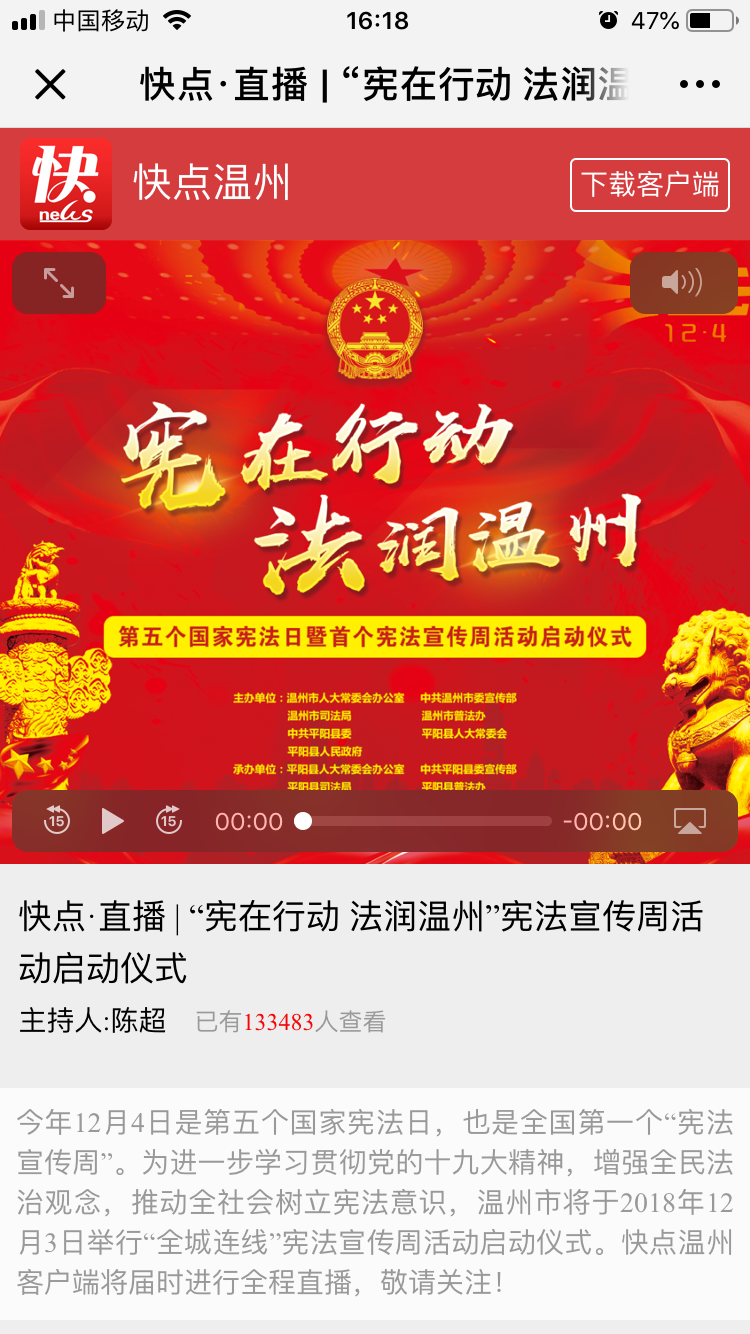 一是组织观看市司法局、普法办主办的“宪在行动 法润温州”宪法宣传周活动启动仪式,深刻感受“全城连线”宪法宣传活动现场氛围。教育引导职工牢固树立宪法意识、增强宪法观念,自觉维护宪法尊严、保障宪法实施,进一步形成人人尊法学法守法用法的良好氛围。