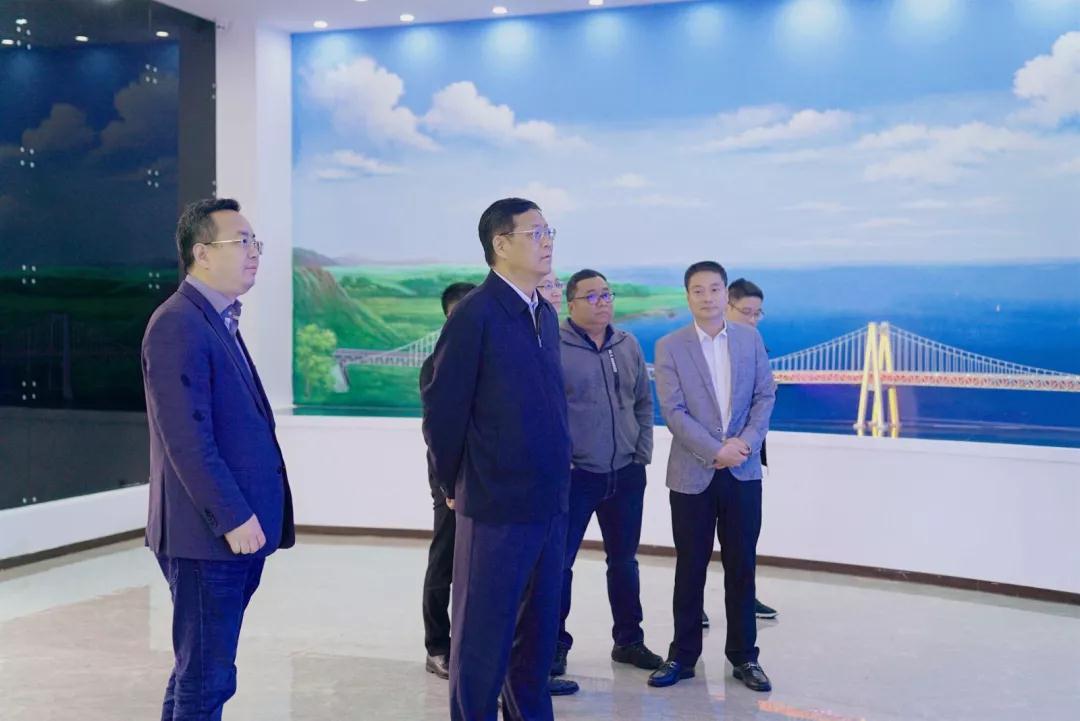 孙维国一行人先来到温州瓯江北口大桥项目南塔栈桥施工现场,听取了项目概况、技术难度等方面的介绍,并仔细询问了项目进度、质量、安全等相关情况。此外,一行人还参观了项目的桥梁建设展示馆,观看项目宣传片、线位图、全息投影、构件模型、BIM展示平台,对北口大桥整体情况有了更加深入的了解。