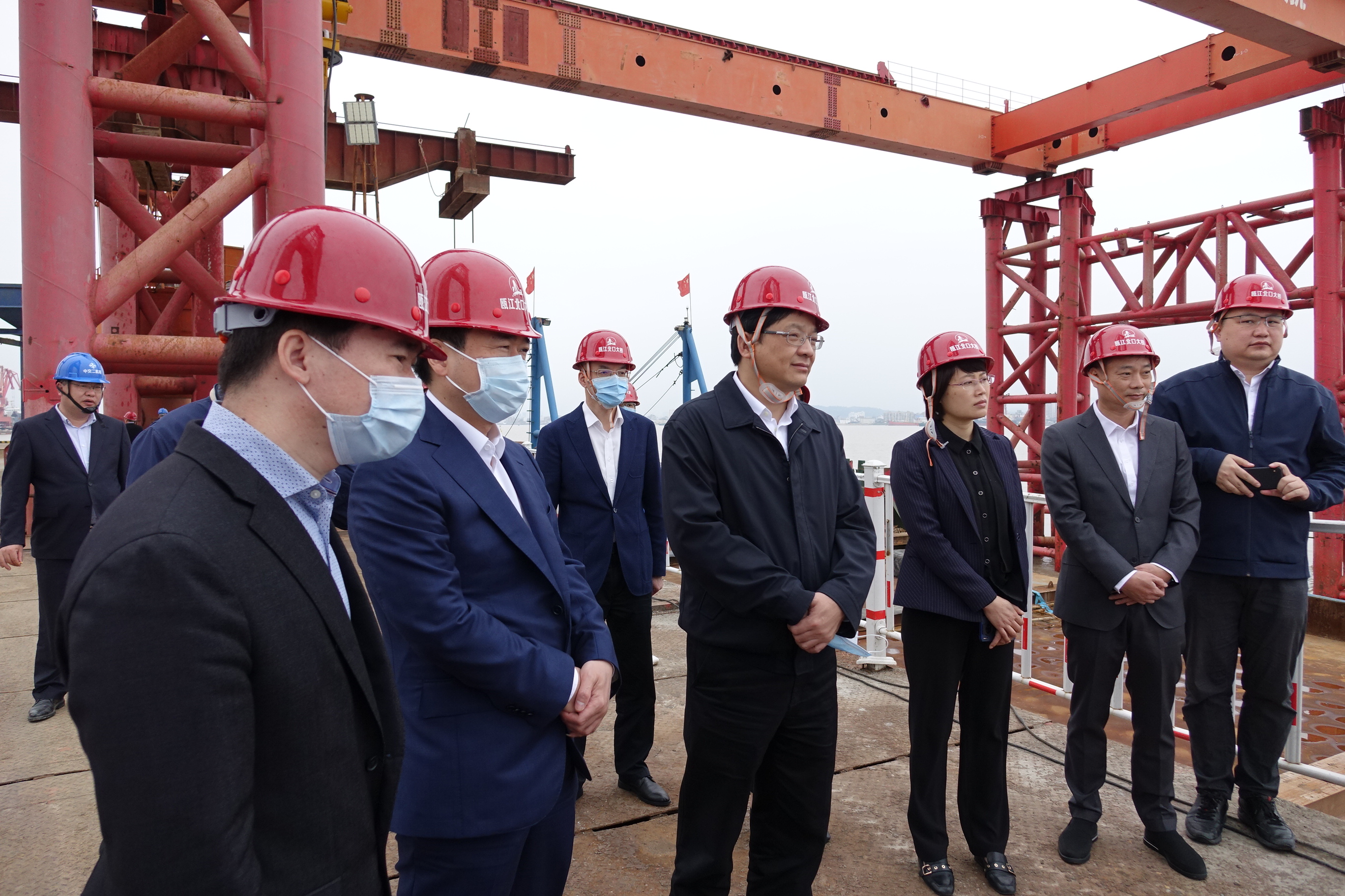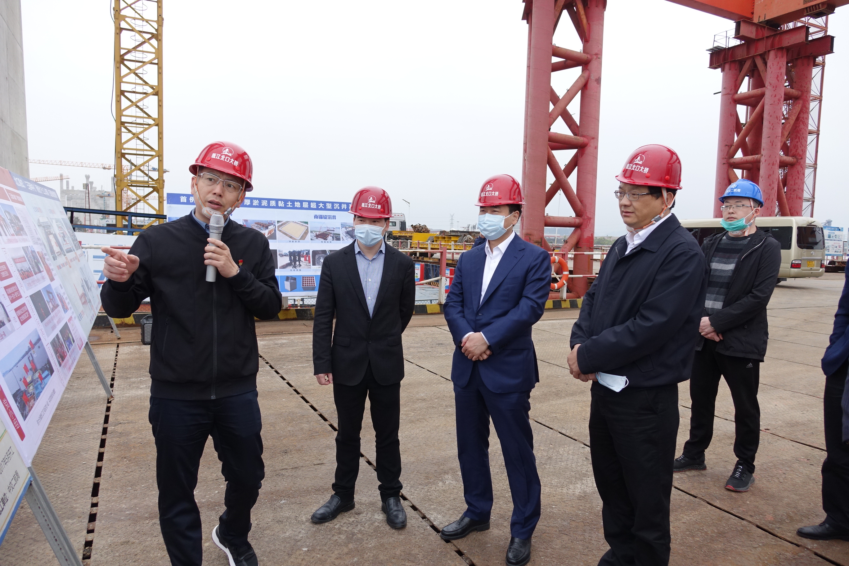 一行人来到项目土建三标南塔施工现场,听取了温州瓯江北口大桥项目整体概况、施工进展、党建工作以及产业工人园等工作情况的汇报,实地查看了项目南塔、南锚碇等关键工程建设情况。
