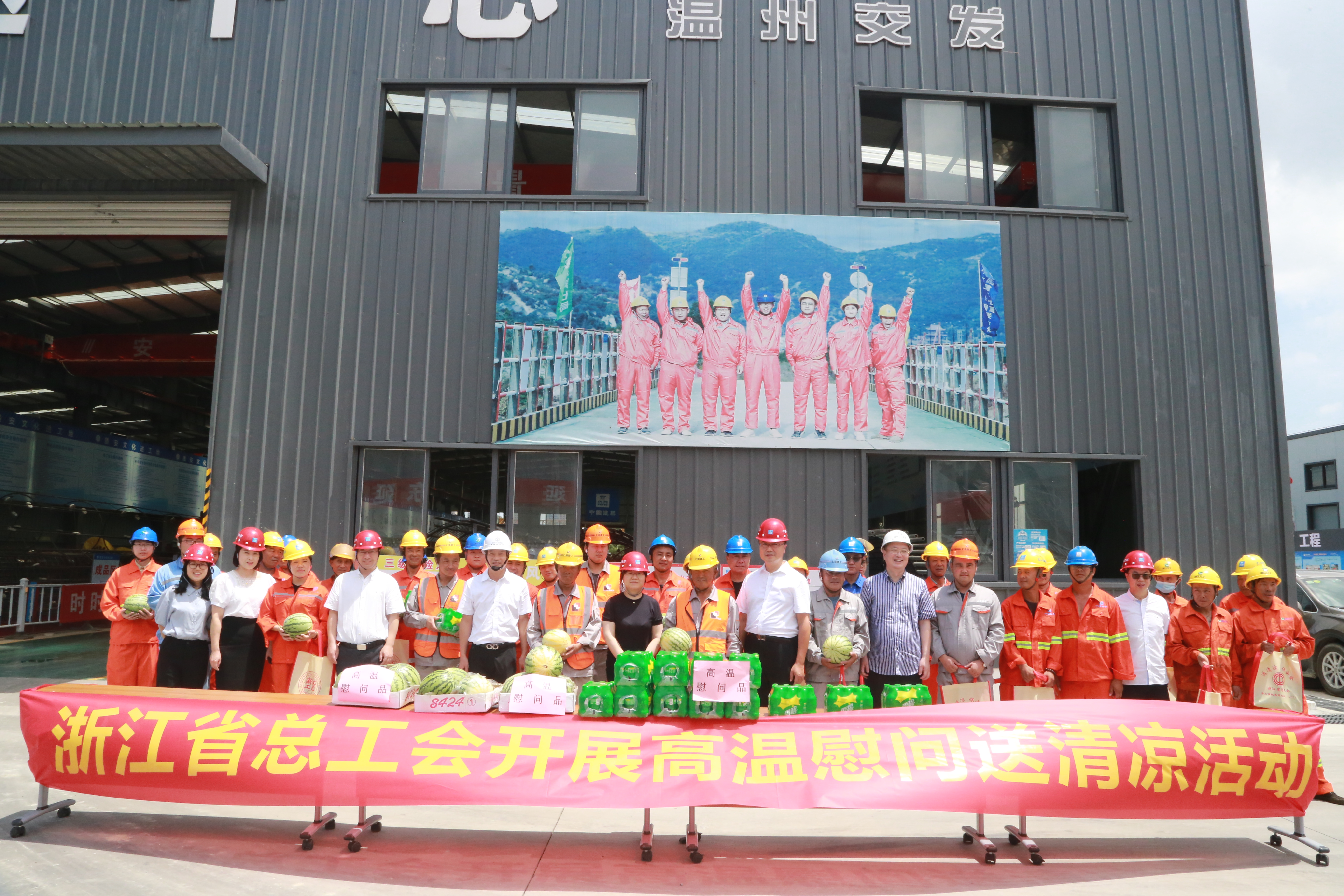 夏日高温天,清凉润心田。7月14日,省总工会党组成员、干部人事处处长胡柯一行赴金丽温高速公路东延线工程开展高温慰问送清凉活动,集团总经理南品仁、党委副书记周列茅陪同慰问。