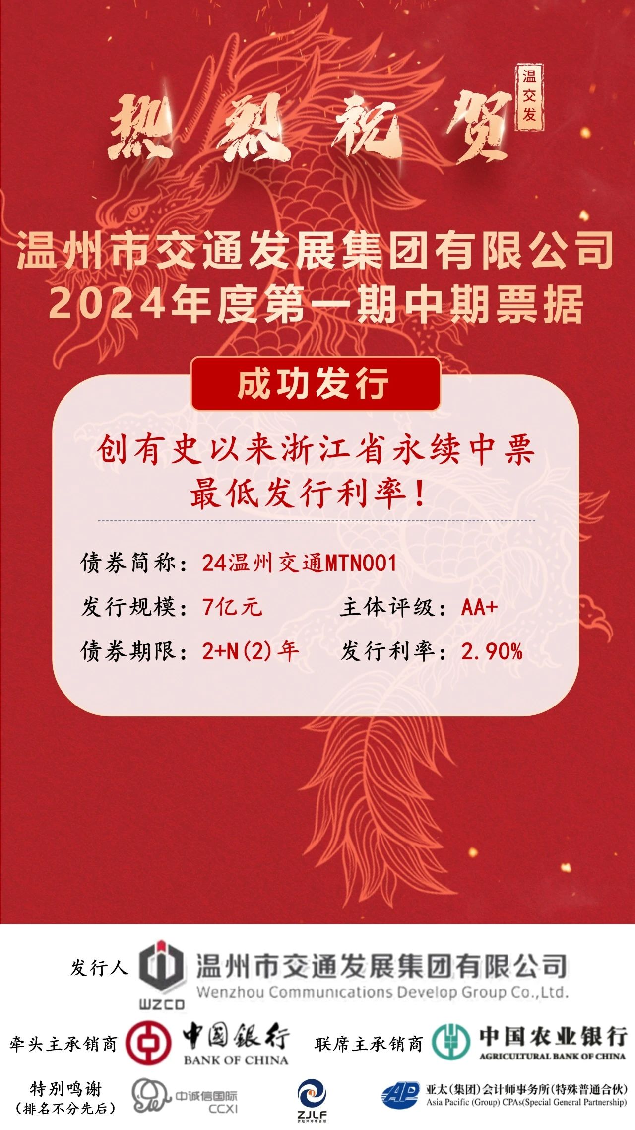3月26日,集团成功发行2024年第一期永续中期票据(以下简称:永续中票),募集资金7亿元,期限2+N,由中国银行牵头主承销,农业银行作为联席主承销商,此次永续中票发行利率为2.9%,全场认购倍数4.4倍,不仅再创集团权益性融资工具票面利率新低,同时也创下浙江省有史以来全评级永续中票最低发行利率!